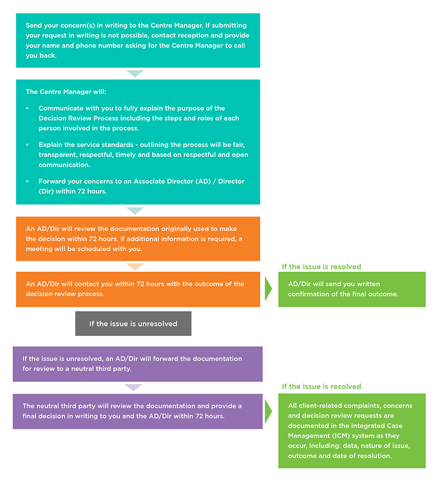 WorkBC Centres will incorporate all feedback received within service delivery operations to improve the WorkBC client experience and provide continuous improvement to services. The Decision Review Process is as follows: